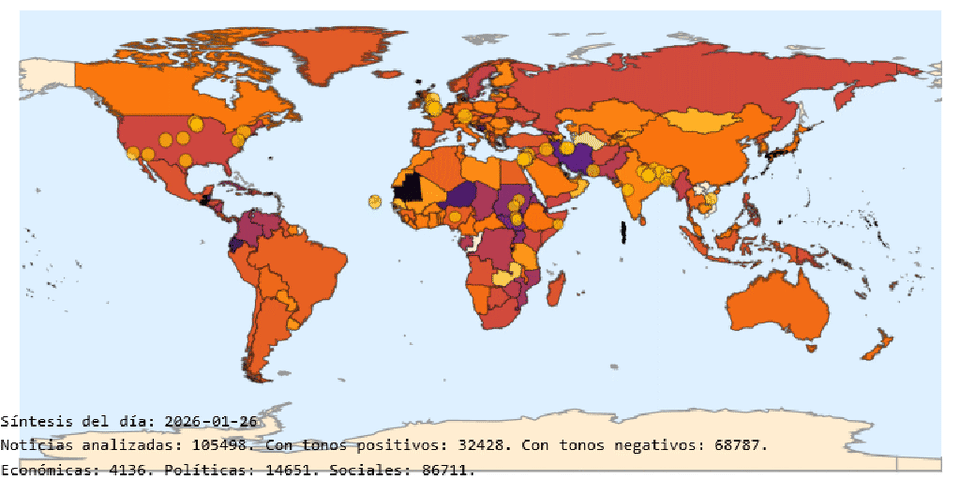 El mapa mostrado resume el perfil informativo del día, elaborado a partir del tono promedio empleado por los medios en la difusión de las distintas noticias que se han podido dar en cada país a lo largo de la jornada, valoradas según la escala de sentimientos fijada por la base de datos GDELT para medir desde lo mejor (10) a lo peor (-10) de las narrativas presentes en el mundo; y dar muestra del nivel de riesgos y conflictos existentes en los distintos territorios, con el marcado de aquellos lugares que han presentado nuevos disturbios sociales.