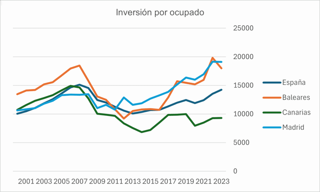 Según parece Canarias se ha situado definitivamente en la cola de las regiones con menor inversión o formación de capital bruto de todo el país. Una mera comparación de la inversión por ocupado en las islas, frente a otras regiones del Estado a lo largo de estas últimas décadas, haría afirmar que el panorama no es muy alentador.